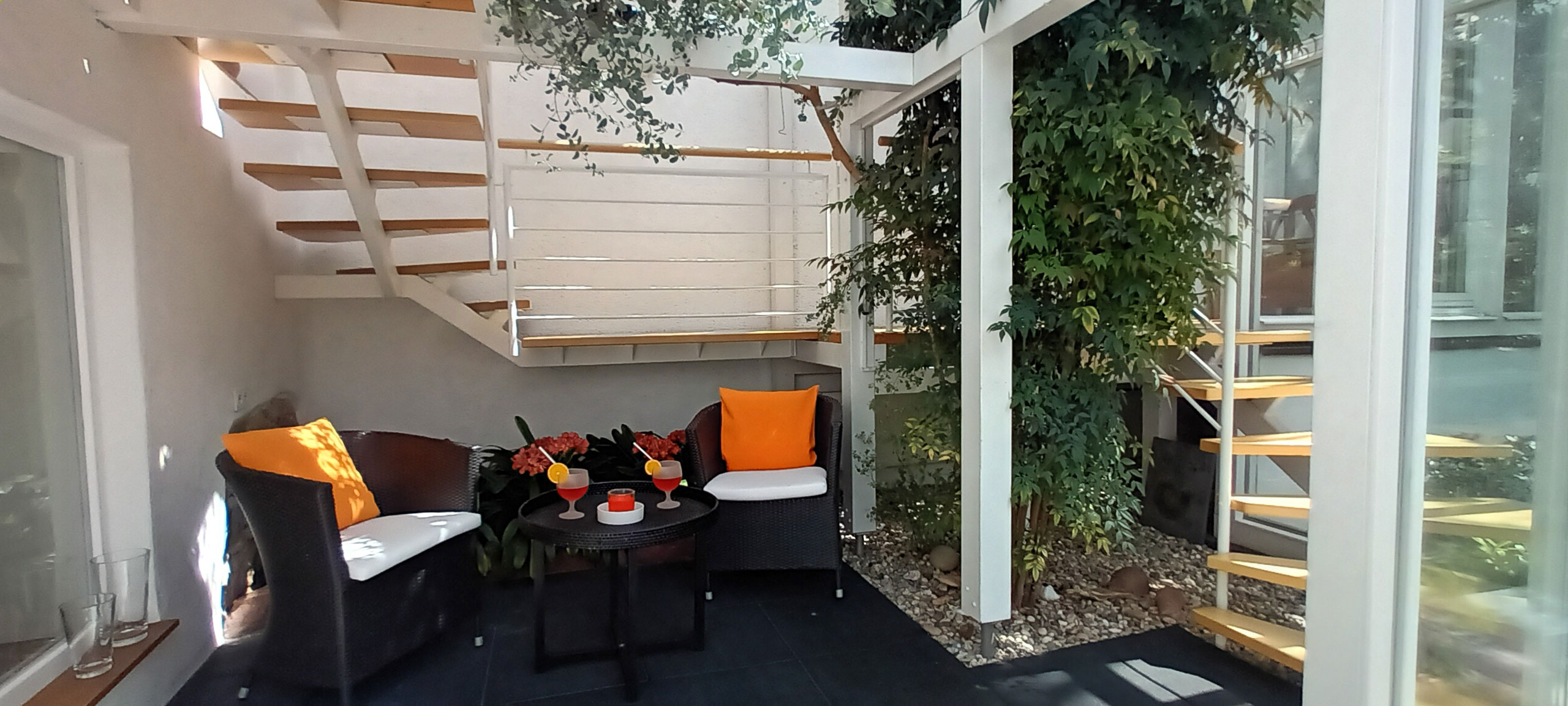 Die Benutzung des mediterran gestalteten Innenhofes sowie des Wintergartens mit unterschiedlichen Sitzebenen ist inklusive.